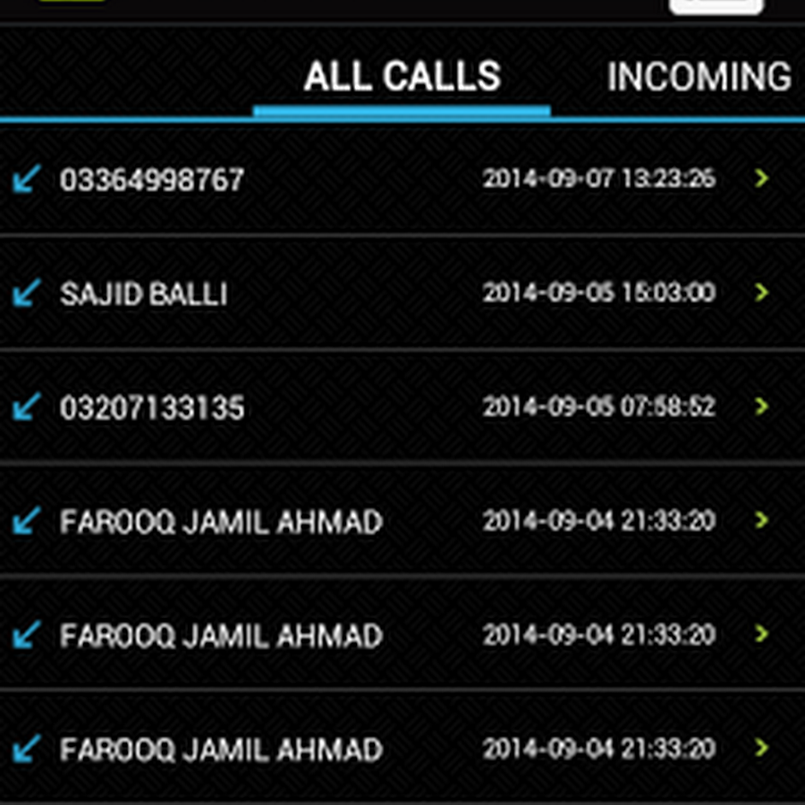 ✓. Manage your name data. You'll be able to see calls as all calls data, solely incoming, solely outgoing, date and time and by names simply.